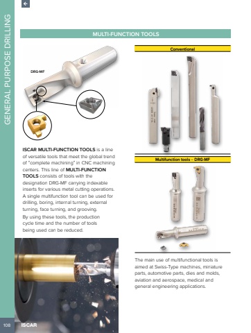 108GENERAL PURPOSE DRILLINGISCARMULTI-FUNCTION TOOLSDRG-MF ISCAR MULTI-FUNCTION TOOLS is a lineof versatile tools that meet the global trendof %u201ccomplete machining%u201d in CNC machining centers. This line of MULTI-FUNCTION TOOLS consists of tools with the designation DRG-MF carrying indexable inserts for various metal cutting operations. A single multifunction tool can be used for drilling, boring, internal turning, external turning, face turning, and grooving. By using these tools, the production cycle time and the number of tools being used can be reduced.ConventionalMultifunction tools %u2013 DRG-MFThe main use of multifunctional tools is aimed at Swiss-Type machines, miniature parts, automotive parts, dies and molds, aviation and aerospace, medical and general engineering applications.
