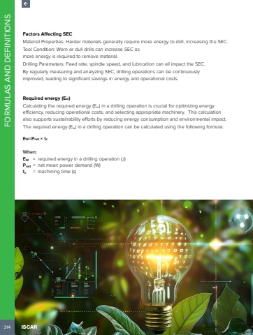 314FORMULAS AND DEFINITIONSISCARFactors Affecting SECMaterial Properties: Harder materials generally require more energy to drill, increasing the SEC.Tool Condition: Worn or dull drills can increase SEC as more energy is required to remove material.Drilling Parameters: Feed rate, spindle speed, and lubrication can all impact the SEC.By regularly measuring and analyzing SEC, drilling operations can be continuously improved, leading to significant savings in energy and operational costs.Required energy (Ew)Calculating the required energy (Ew) in a drilling operation is crucial for optimizing energy efficiency, reducing operational costs, and selecting appropriate machinery. This calculation also supports sustainability efforts by reducing energy consumption and environmental impact.The required energy (Ew) in a drilling operation can be calculated using the following formula:EW=Pnet %u00d7 tcWhen:EW = required energy in a drilling operation (J)Pnet = net mean power demand (W)tc = machining time (s)