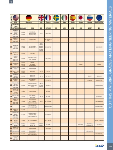 349CUTTING MATERIAL GRADES AND ENGINEERING MATERIALS Material Group No.USA Germany U.K. France Sweden Italy Spain Japan Russia EURONORMAISI/SAE/UNS/ASTM/AA Werkstoff DIN BS AFNOR SS UNI UNE JIS GOST EN33Hastelloy X;N06002;5390A;AMS 5754;AMS 55362.4603;2.4665NiCr30FeMo;NiCr22Fe18Mo;NiCr21Fe18Mo9HR 6 NC 22 FeD33Inconel 617;N06617;AMS 58872.4663a NiCr23Co12Mo NC 14 K 9 T 5 DWA33Nimonic 90;N07090;AMS 58292.4632;2.4969NiCr20Co18Ti;NiCr 20 Co 18 TiHR 2;HR202;HR 402;HR 501;HR 502;HR 503Z 8 NCDT 42 NiCr20Co18Ti33 Haynes 214;NO7214 2.4646 NiCr16Al33Rene 41;N07041;AMS 5712;AMS 57132.4973 NiCr19Co11MoTi;NiCr 19 CoMo NC 19 KDT33 Hastelloy B2;N106652.4617;2.4616;2.4615NiMo28;EL-NiM29;SG(UP)-NiMo27YNiMo-7 NiMo2833 Udimet L-605;R30605 2.4964 CoCr20W15Ni33 Monel R-405;N044052.4360;2.4361 NiCu30Fe NA 13 NU 3033Inconel 600;N06600;AMS 56652.4816 NiCr15Fe8;NiCr 15 Fe NA 14 NC 16 FeT ChN78T NiCr15Fe833 Inconel 601;N06601 2.4851 NiCr23Fe15A;NiCr 23 Fe N C 23 FeA ChN60Yu NiCr23Fe15A33Nimonic 263;N07263;AMS 5872;AMS 58862.4650NiCo20Cr20MoTi;NiCo 20 Cr 20 MoTi MoTiHR 10;HR 206;HR 404NCK 20 D NiCo20Cr20MoTi34Haynes 188;Jetalloy 209;R30188;AMS 57722.4964 CoCr22W14Ni KC22WN34 Monel K-500;N05500 2.4375 NiCu30Al3Ti;NiCu 30 Al NA 18 NU 30 AT NiCu30Al3Ti34Inconel 718;N07718;AMS 5596;AMS 55892.4668NiCr19Nb5Mo3;NiCr 19 NbMo;NiCr19Fe19Nb5Mo3HR 8 NC 19 Fe Nb NiCr19Nb5Mo334 2.4955 NiFe25Cr20NbTi;NiFe 25 Cr 20 NbTi NiFe25Cr20NbTi NiFe25Cr20NbTi34 Incoloy 925;N09925 2.467034Nimonic 901;N09901;AMS 5660;AMS 56612.4662NiFe35Cr14MoTi;NiCr13Mo6Ti3;NiCr 13 Mo 6 Ti 3Z8 NCDT 4234Udimet 500;N07500;AISI 6842.4983 NiCr18Co18MoAlTi NCK 19 DAT NiCr18Co18MoAlTi34 Nimonic 80A;N070802.4631;2.4952NiCr20TiAl;NiCr 20 TiAlHR 401;HR 601 NC 20 TA NCF 80 A ChN77TYuR;ChN56VMTYu NiCr20TiAl34 Jetalloy 209;AMS 5772 CoCr22W14Ni KC 22 WN34 Altemp S-816 2.4989 CoCr20Ni20W Altemp S-81634 MAR-M 246 2.4675 NiCr23Mo16Cu;NiCr 23 Mo 16 Cu NiCr23Mo16Cu34Inconel 722;N07722;AMS 5411