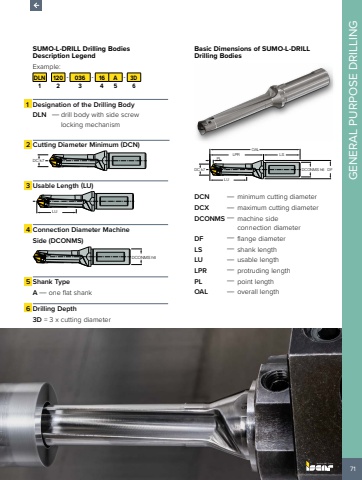71GENERAL PURPOSE DRILLINGSUMO-L-DRILL Drilling Bodies Description Legend Example:DLN 120 - 036 - 16 A - 3D1 2 3 4 5 61 Designation of the Drilling BodyDLN %u2014 drill body with side screw locking mechanism2 Cutting Diameter Minimum (DCN)DC k73 Usable Length (LU) LU4 Connection Diameter Machine Side (DCONMS) DCONMS h65 Shank TypeA %u2014 one flat shank6 Drilling Depth3D = 3 x cutting diameterBasic Dimensions of SUMO-L-DRILL Drilling BodiesDCONMS h6 DFLPR LSOALPLDC k7LUDCN %u2014 minimum cutting diameterDCX %u2014 maximum cutting diameterDCONMS %u2014 machine side connection diameterDF %u2014 flange diameterLS %u2014 shank lengthLU %u2014 usable lengthLPR %u2014 protruding lengthPL %u2014 point lengthOAL %u2014 overall length