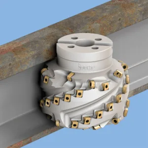 In rough milling, special TANGMILL cutters with face-mounted indexable inserts are great for machining crossings and transition rails made of manganese alloy steel. The cutter’s positive rake cutting action dramatically reduces forces and improves tool consistency in difficult-to-clamp rail shapes while providing a smooth cut and eliminating hard finishing applications.