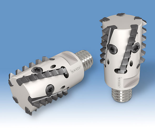 MULTI-MASTER threading products include various exchangeable heads with both full and partial thread profiles of 60° and 55°, known for their impressive reliability and dimensional repeatability. This range is continually expanding with the introduction of new heads. One of the latest developments is the high-performance thread milling head with spiral single-sided inserts (Fig. 4). The helical cutting edge ensures smooth and stable cutting, which significantly reduces cutting forces and power consumption. The benefits of the helical edge are especially pronounced when thread milling with a high tool overhang, particularly when using the new anti-vibration shanks.